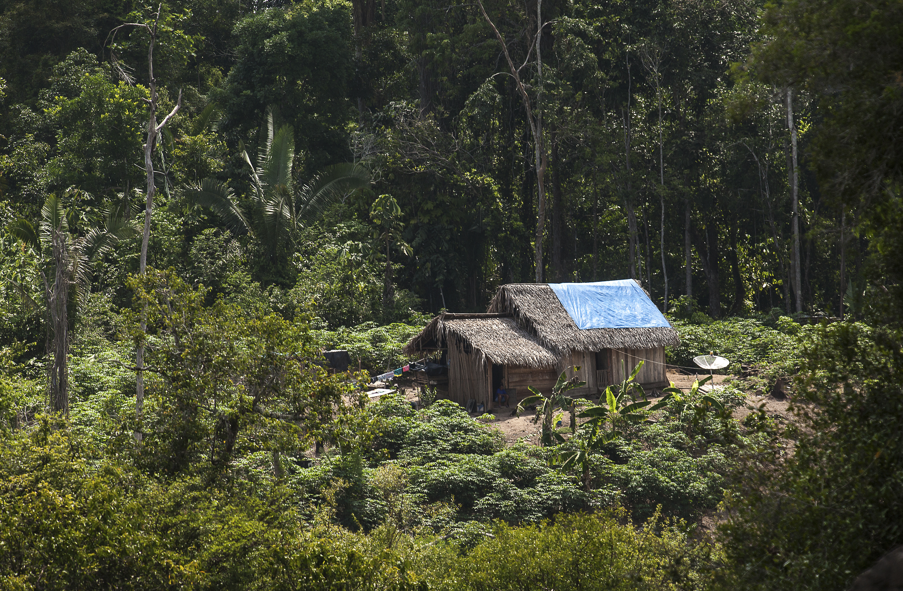 Casa tÃpica da região, à s margens do rio com a mata ao fundo