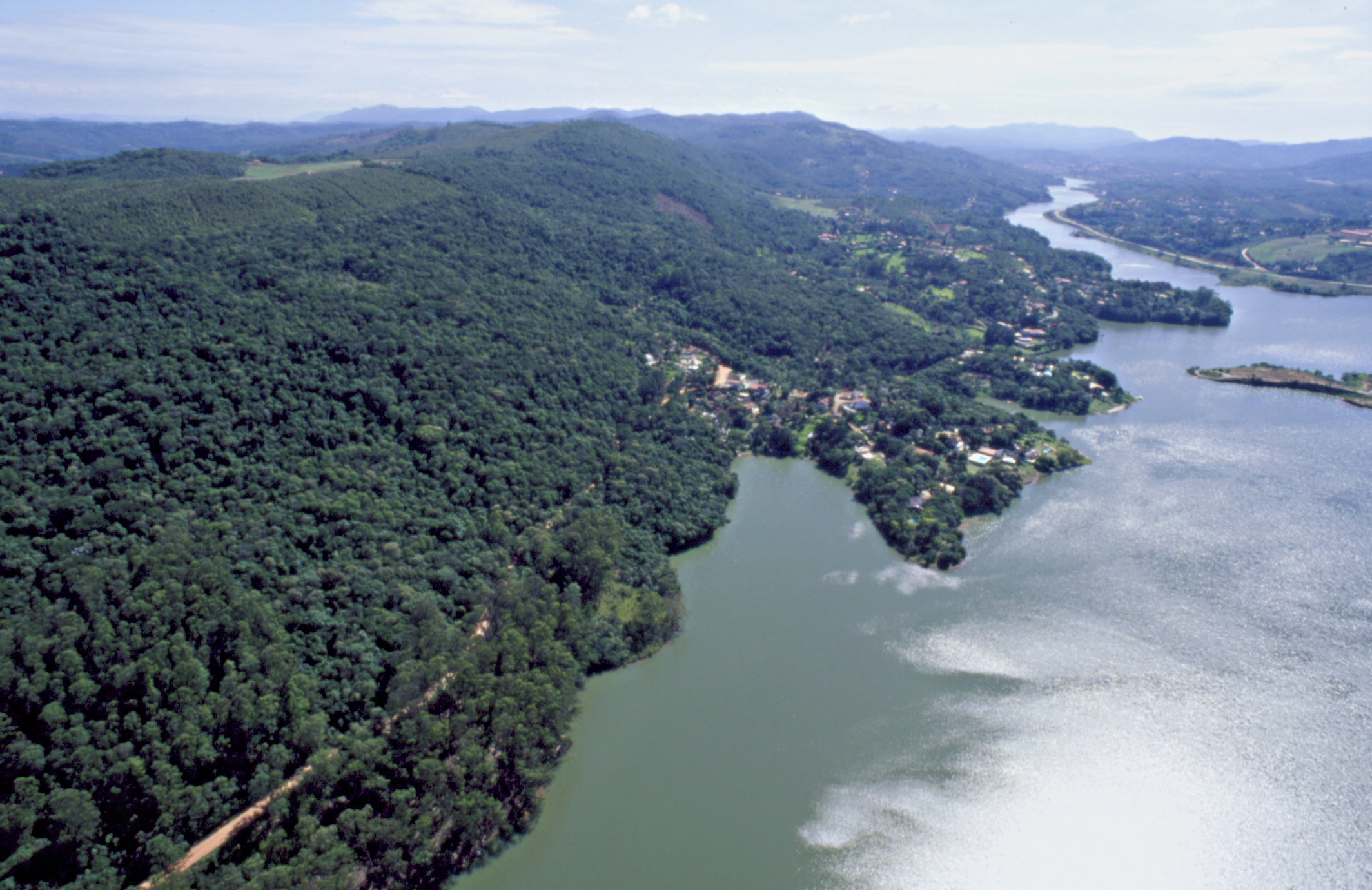 Sistema Cantareira - vista da margem direita do reservatório com casas de alto padrão e entrada do canal do Juquery no reservatório.