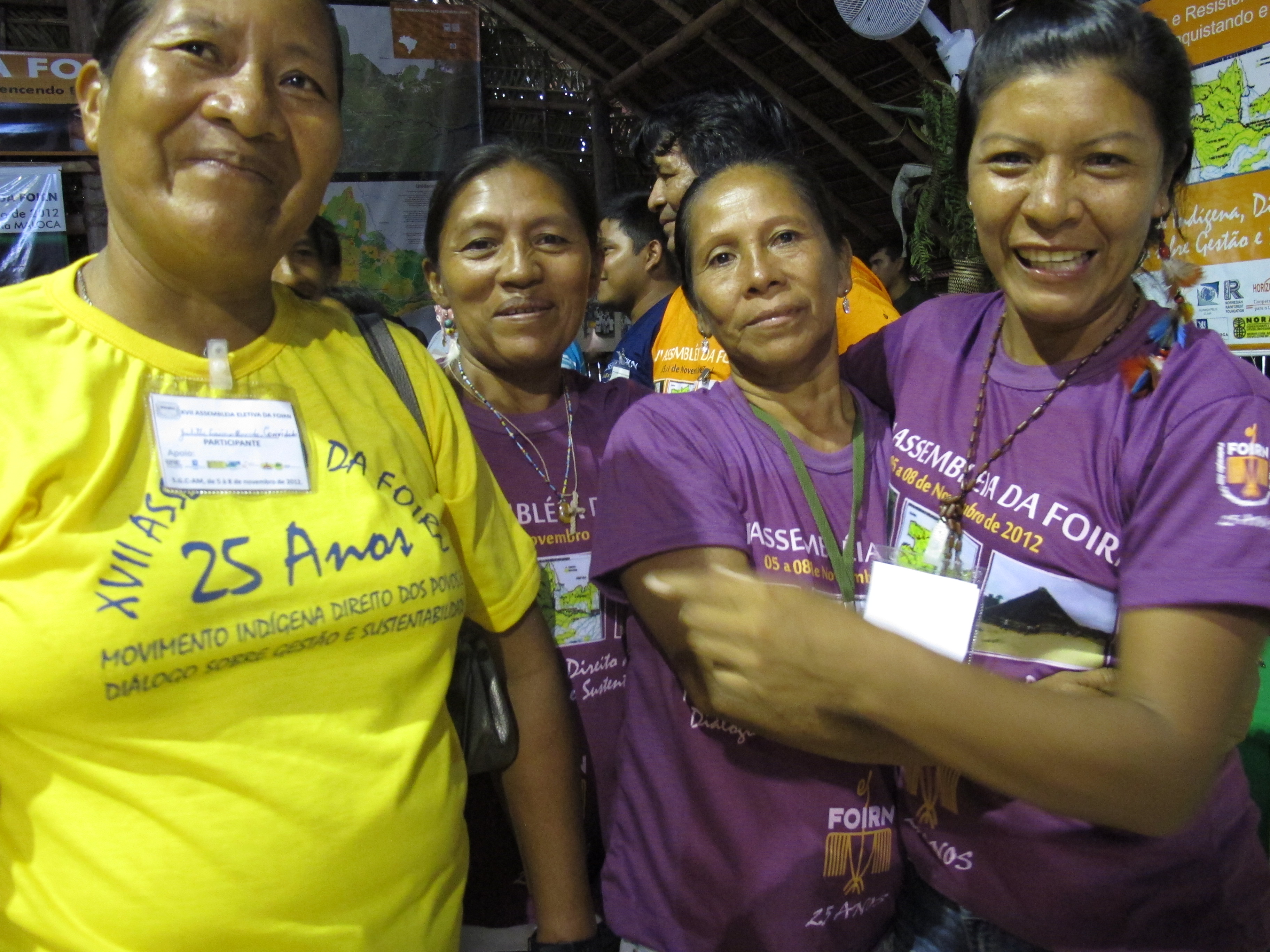 A nova presidente, Almerinda Ramos de Lima (Tariana) (primeira à dir.)é saudada (da dir. para a esq.) por Maria Diva Moreira (Tariana), Carmem Figueiredo (Wanano) e Judite Teixeira (Wanano) , XVII Assembleia da Federação das Organizações Indígenas do Rio Negro (Foirn), São Gabriel da Cachoeira, Amazonas.