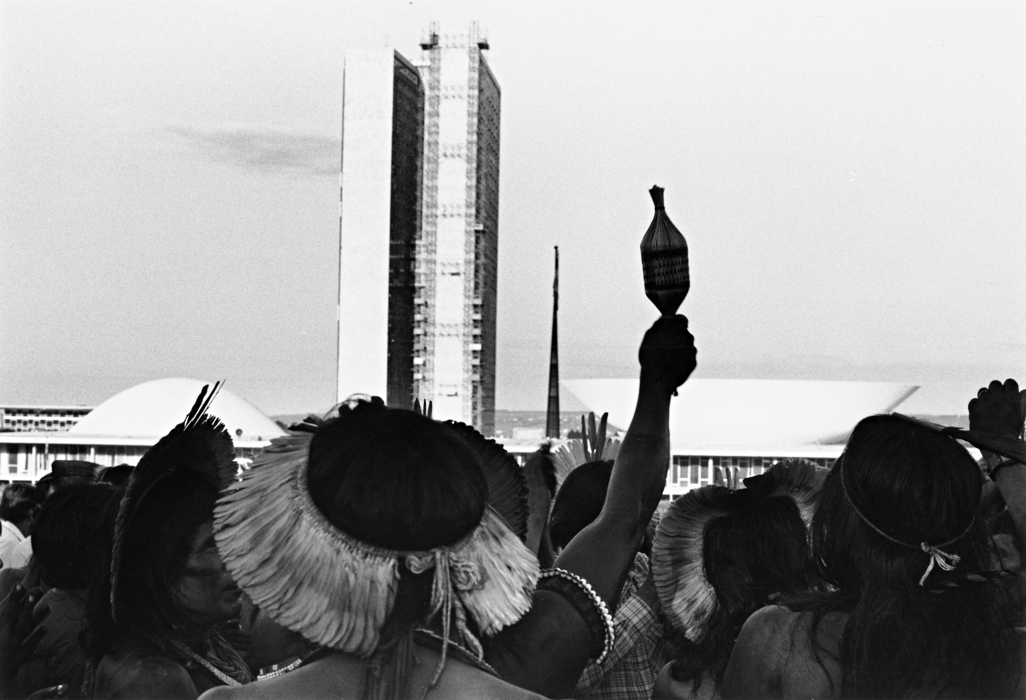 Índios de vários povos comemorando a votação do capítulo sobre seus direitos em primeiro turno na Constituinte, ao fundo o Congresso Nacional, Brasília.