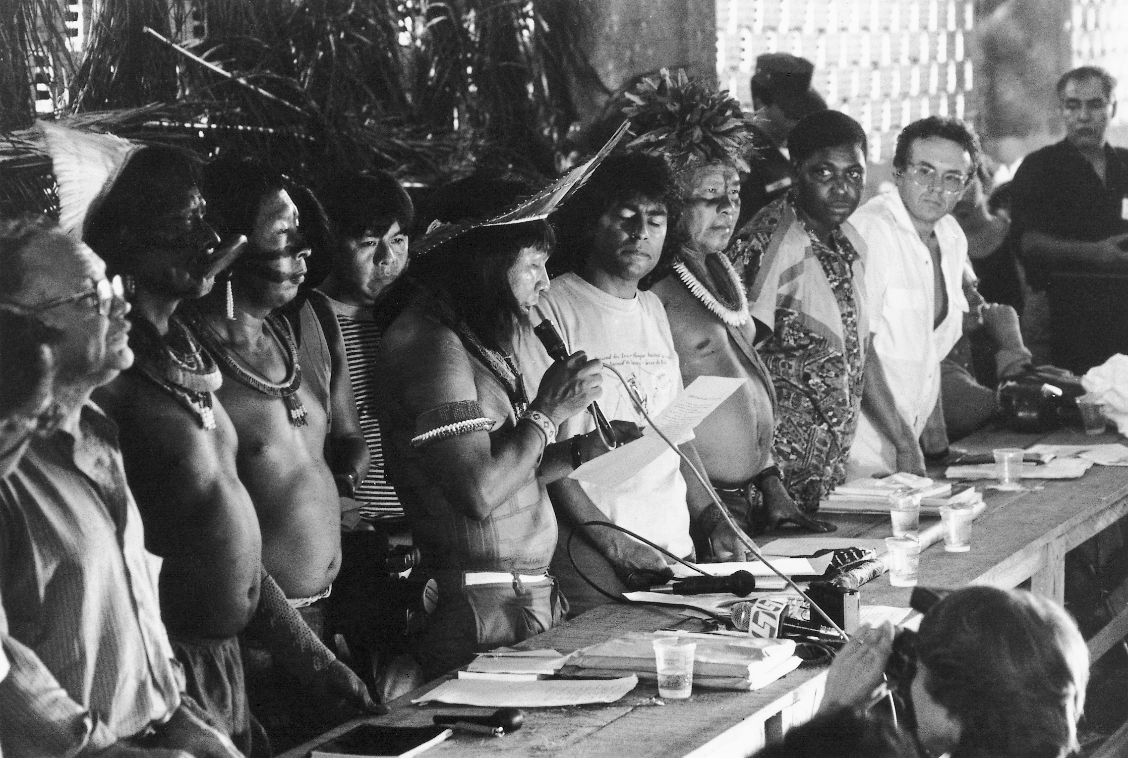 Paiakan encerra o encontro com a leitura da Declaracao Indígena, Encontro de Altamira, 02/1989